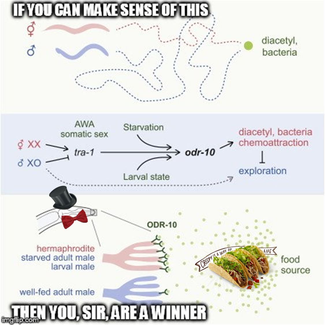 In response to this inquiry, hermaphrodites were shown to primarily use an AWA olfactory neuron pair (sensory neurons), while the secondary contribution came from AWC neurons. In males, however, their attraction to diactyl only utilizes the AWC, completely neglecting the use of AWA. This proves that genetic sex reconfigures the diacetyl circuit. Where females rely on two sensory neuron pairs to sense diactyl, males rely on only one. To make it more plain and simple to the layman: Hermie gets double the pleasure and double the fun from food than our Male, because she has two sets of neurons running, whereas our male doesn’t activate his second set. He has no idea how goddamn good a Burrito can even be.